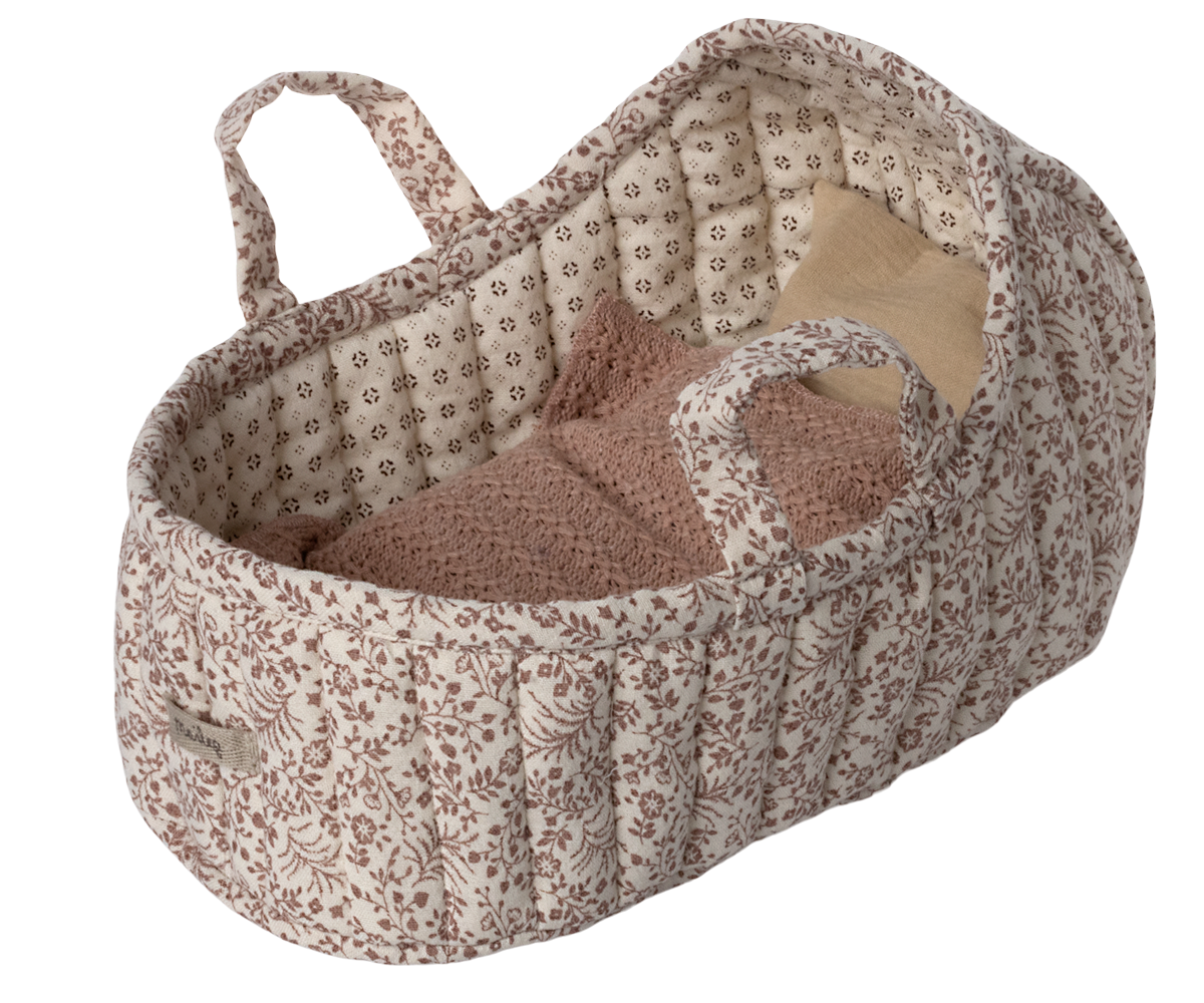A small portable bed for your soft friends - Bunny plush and small Safari friends fit perfectly. With this carrycot, it is easy to bring along your friend. Your friend will sleep tight with the soft pillow and under the warm knitted blanket.