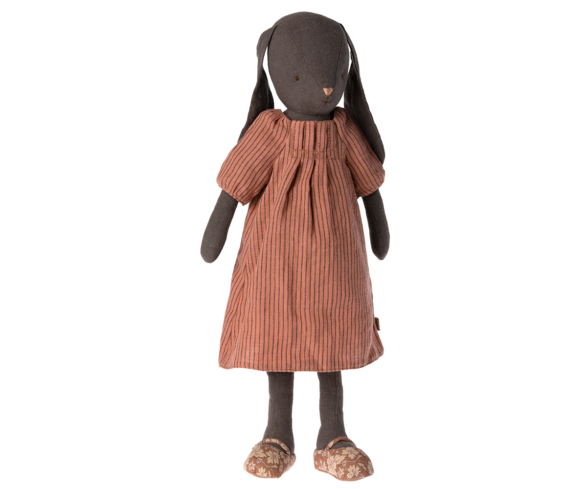 A classic bunny made of soft natural linen fabric that gives a lovely hand feel and look. She is dressed up in a striped dress and shoes with a beautiful print. Check out our clothes collection to expand the bunny's wardrobe.