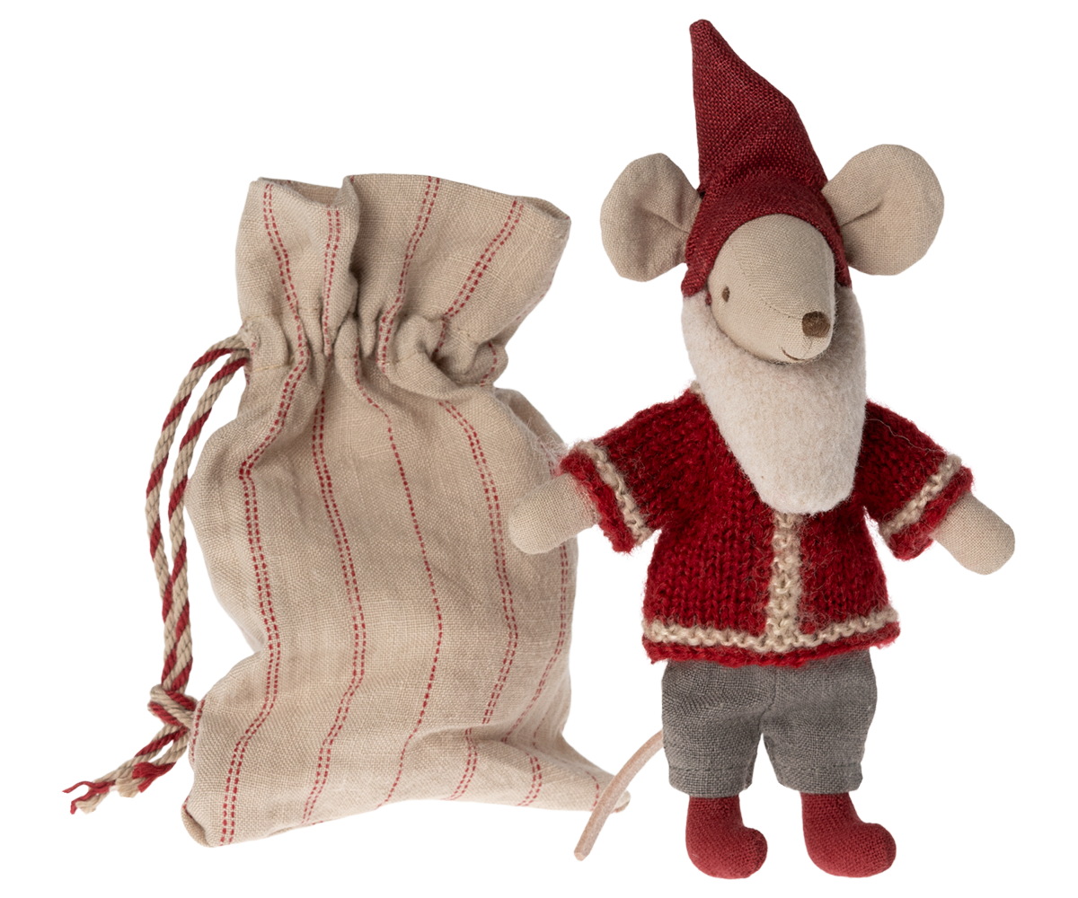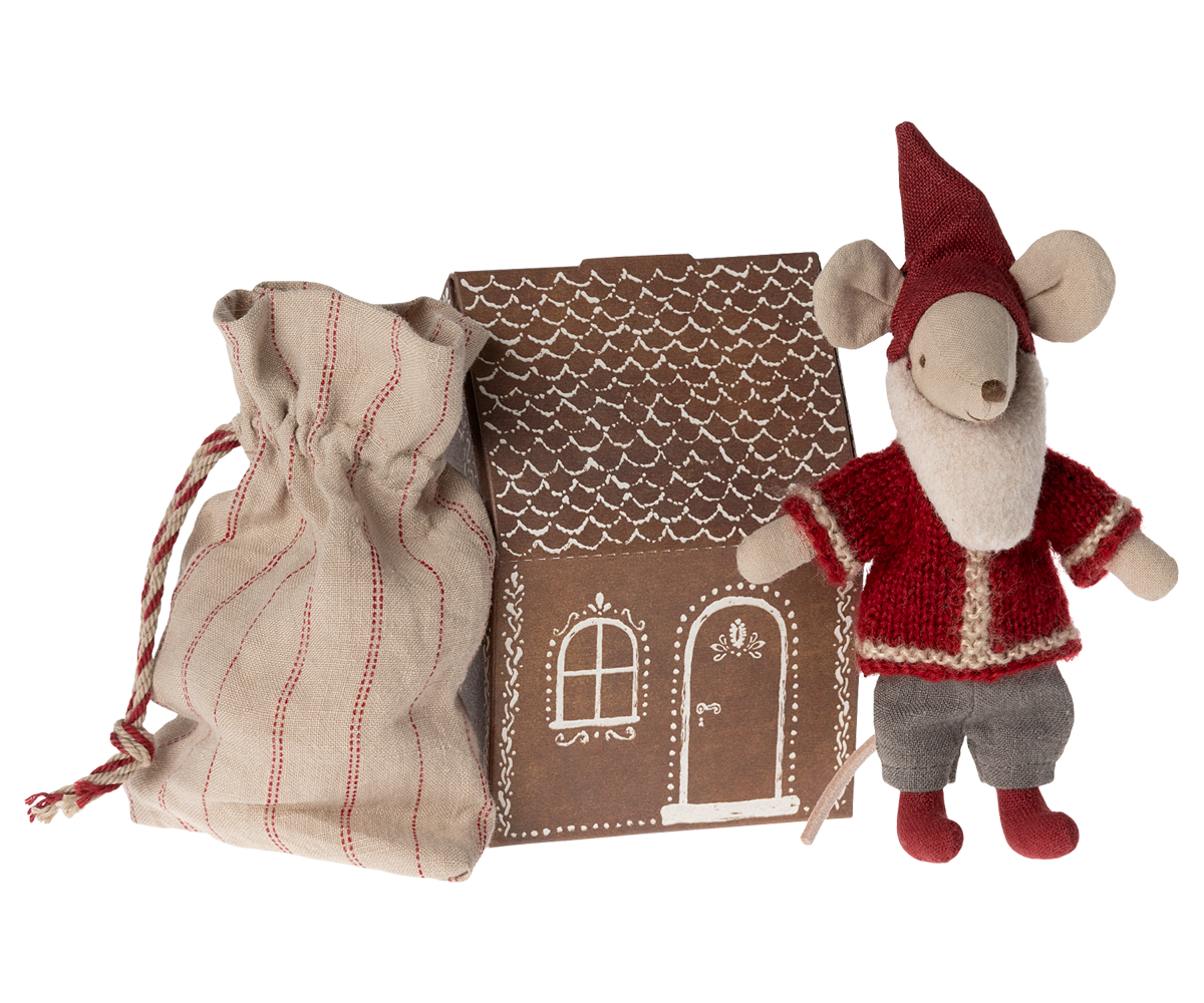 Big brother mouse dressed in classic Santa clothes. He lives in a small house, and has a sack for all the presents he has to deliver on Christmas night. He fits perfectly into the bigger Maileg Gingerbread house as he can slide through the chimney.